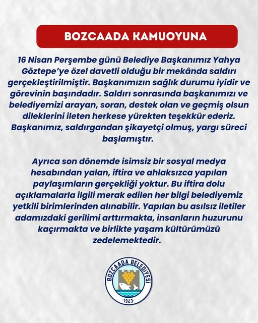 16 Nisan Perşembe günü Belediye Başkanımız Yahya Göztepe’ye özel davetli olduğu bir mekânda saldırı gerçekleştirilmiştir. Başkanımızın sağlık durumu iyidir ve görevinin başındadır. Saldırı sonrasında başkanımızı ve belediyemizi arayan, soran, destek olan ve geçmiş olsun dileklerini ileten herkese yürekten teşekkür ederiz. Başkanımız, saldırgandan şikayetçi olmuş, yargı süreci başlamıştır.