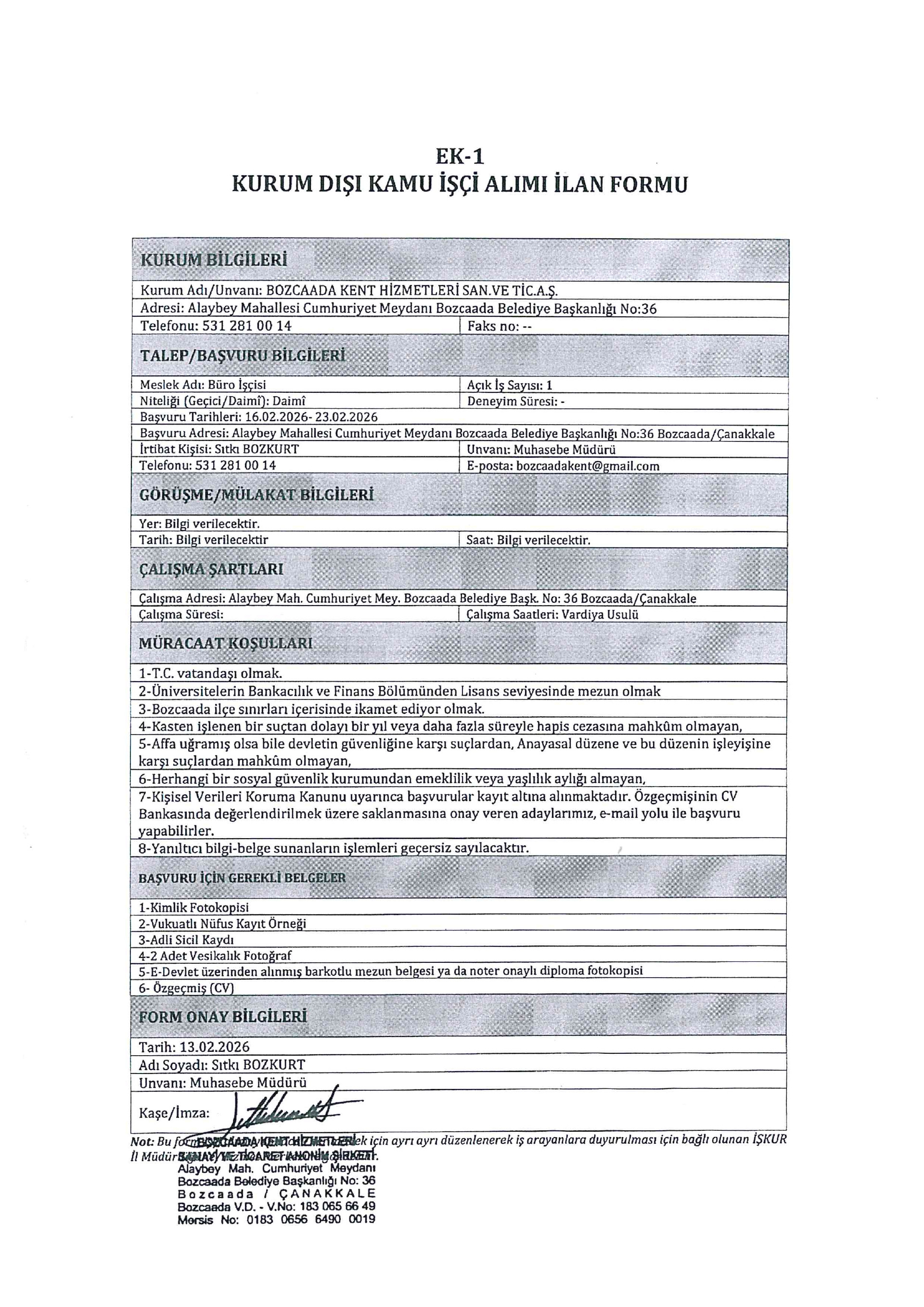 Bozcaada Kent Hizmetleri 1 İşçi Alacak. Son başvuru tarihi 23 Şubat 2026