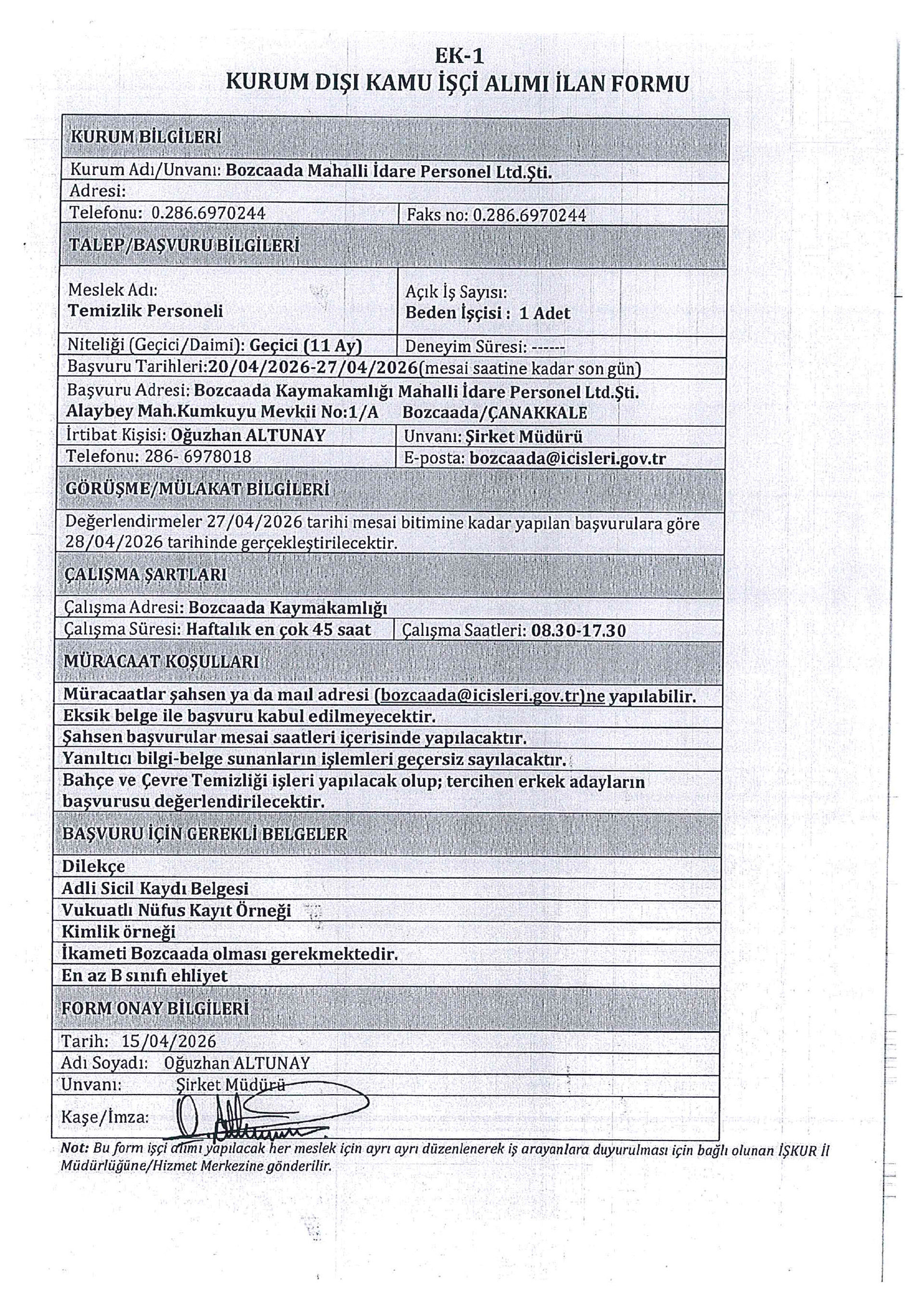 Bozcaada Mahalli İdare Geçici 1 İşçi Alacak. Son başvuru tarihi 27 Nisan 2026
