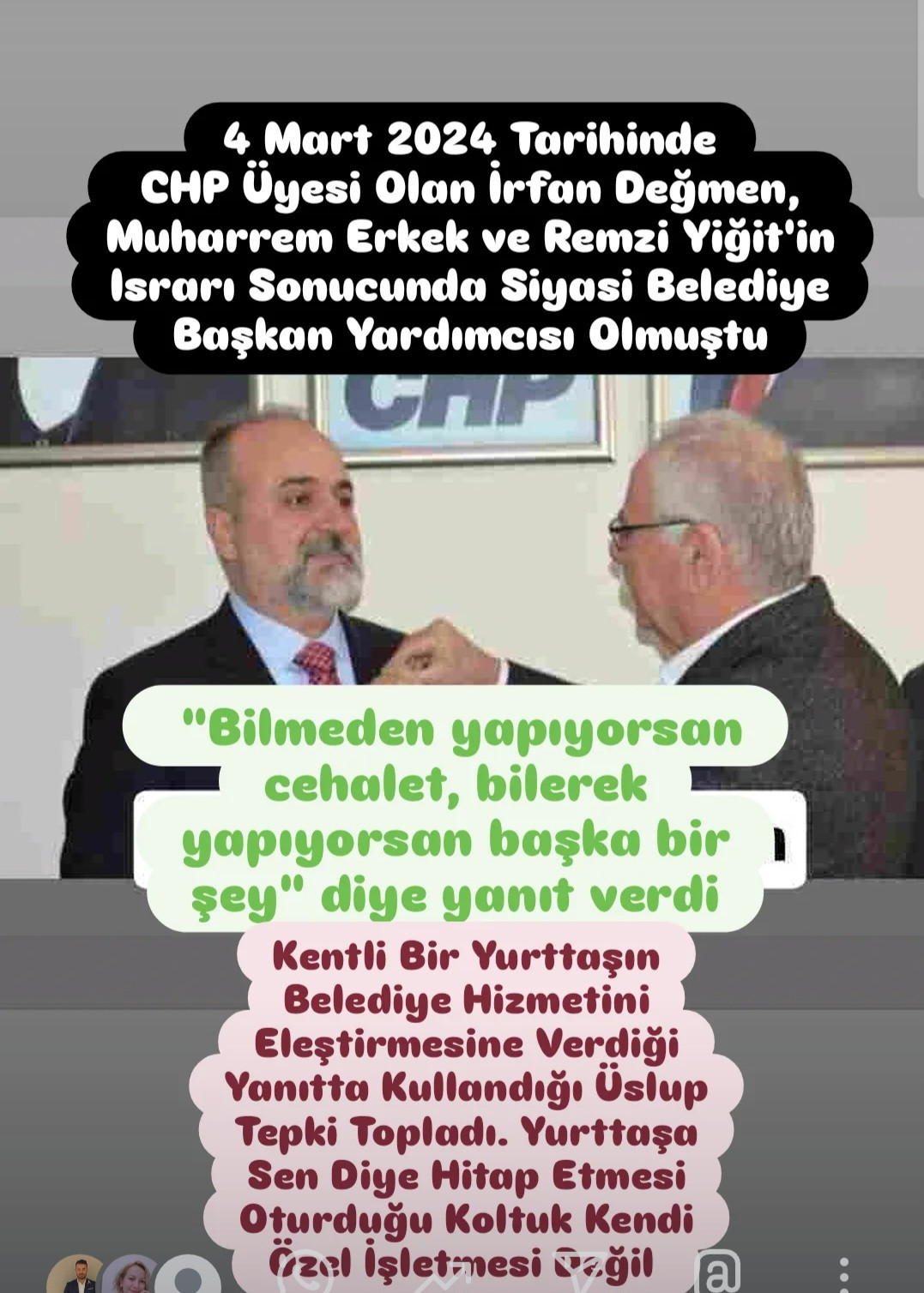 Örgüt disiplini ve geleneği yok. Tamam biliyoruz ama oturduğu koltuk kendi özel şirketinin koltuğu değil. Muharrem Erkek'in kontenjanından belediye meclis üyesi yazılan-seçilen Dehmen, belediye de çalışan akrabasının yükseltilmesi tartışmaları kamuoyunu meşgül etmişti.