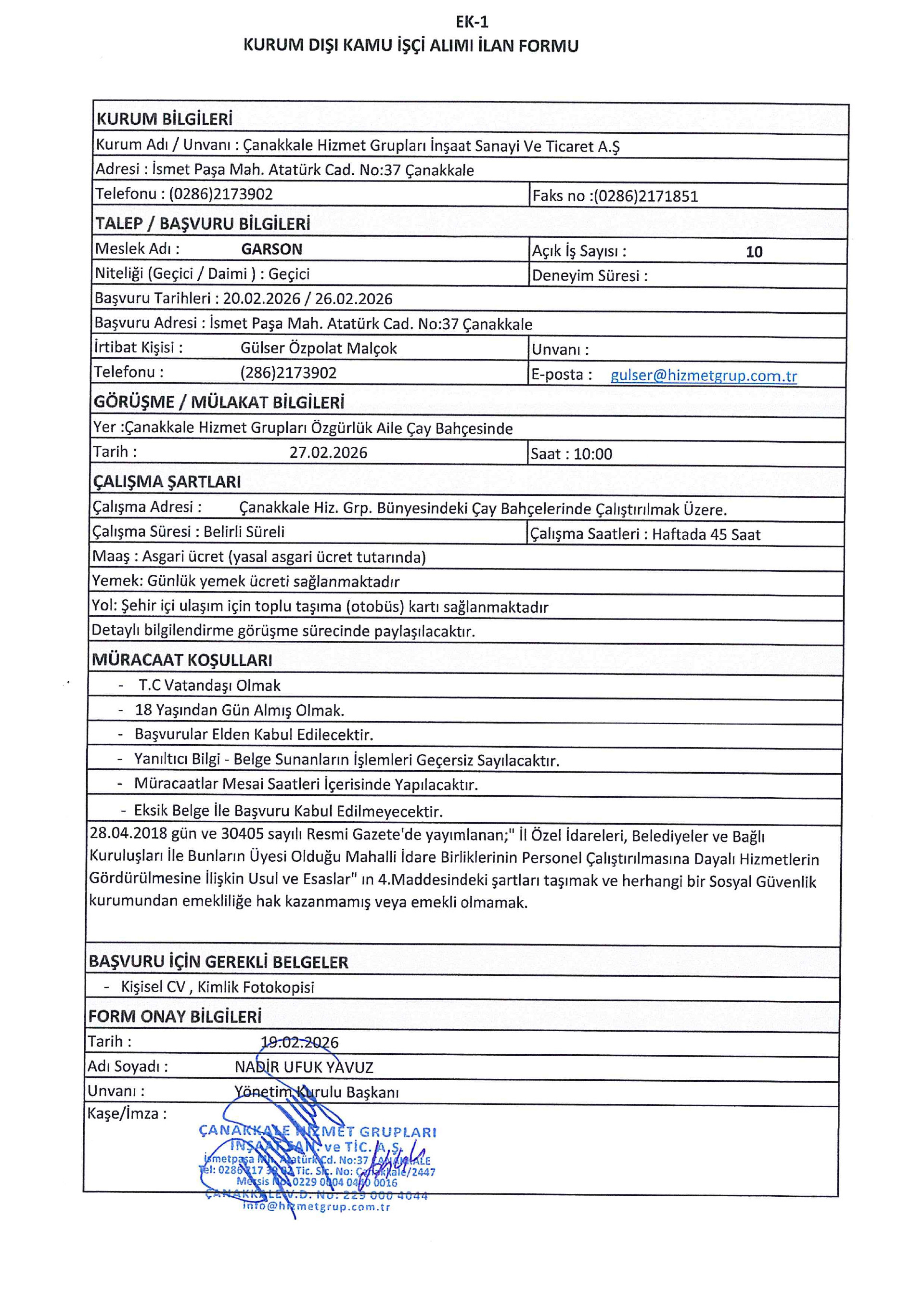 Çanakkale Hizmet Grupları Geçici 10 İşçi Alacak. Son başvuru tarihi 26 Şubat 2026