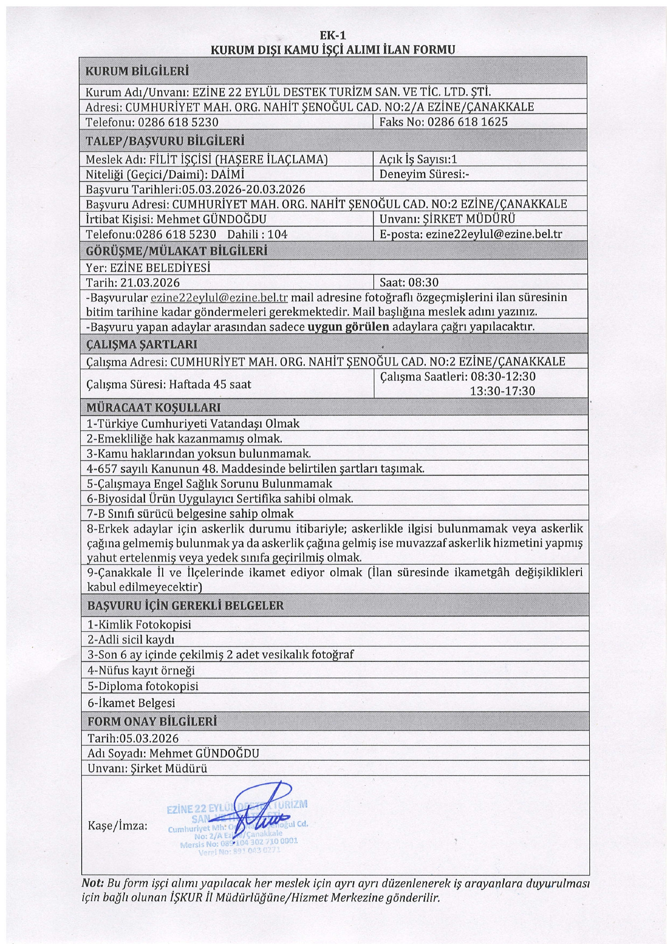 Ezine 22 Eylül Destek Turizm 1 İşçi Alacak. Son başvuru tarihi 20 Mart 2026